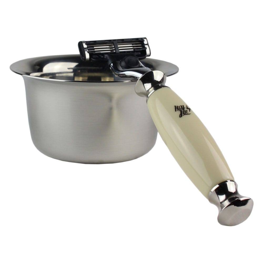 De perfecte combinatie van ivoor met nikkel details zorgt voor een vleugje moderniteit aan dit buitengewone scheermes dat compatibel is met het Gillette® Mach 3 wegwerp-messysteem.