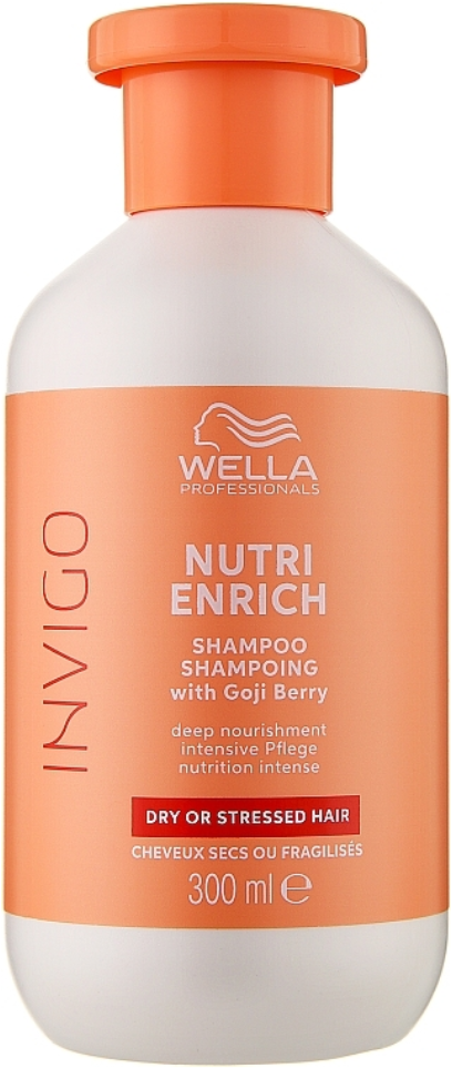 Wella Professionals Invigo Nutri Enrich Shampoo is een intensief voedende en hydraterende shampoo voor droog en beschadigd haar. Geformuleerd met Nutri-Enrich-Blend™ en panthenol om het haar te hydrateren en te voeden, voor meer zachtheid, glans en vitaliteit. Deze shampoo is verrijkt met goji bes, een ingrediënt dat rijk is aan vitaminen, mineralen en peptiden en helpt direct frizz te verminderen door het haar glad te maken. Gebruik naast de shampoo ook de Nutri Enrich conditioner en masker voor het beste resultaat.