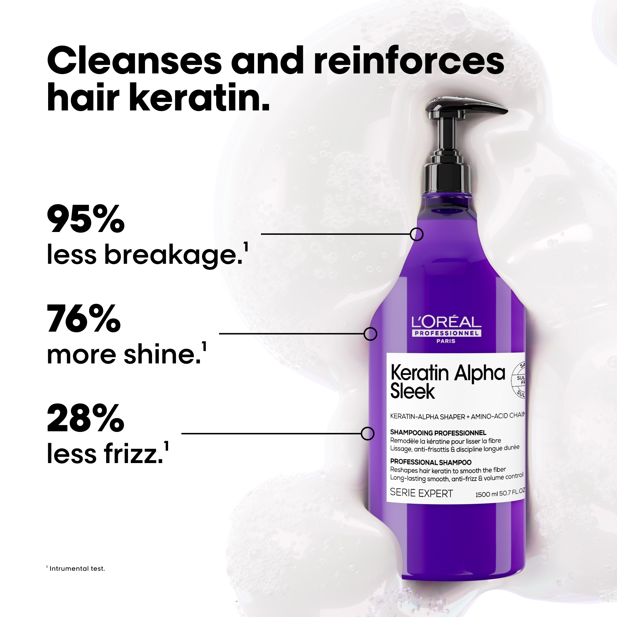 Bij gebruik van de complete Keratin Alpha Sleek routine kan het haar tot 2 weken glad en pluisvrij blijven*.