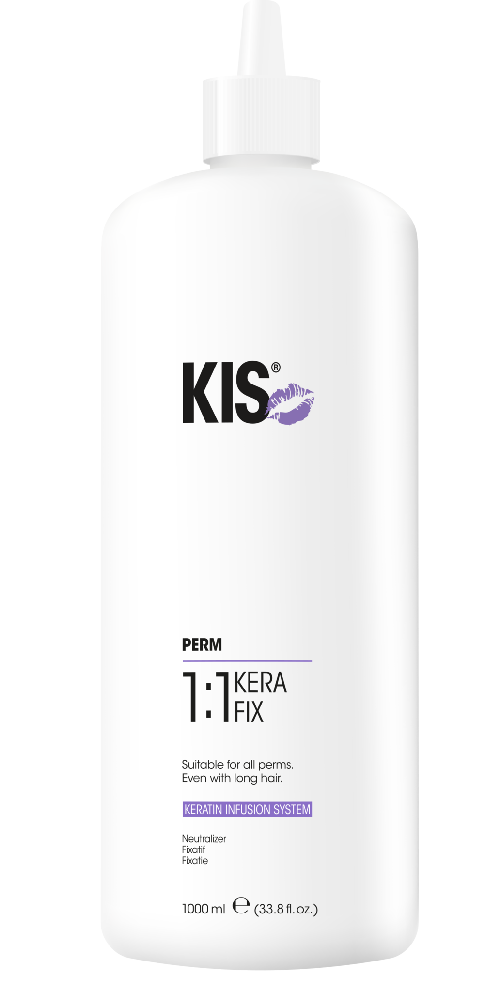 De KIS Kerafix 1:1 is een fixatievloeistof die wordt gebruikt na een permanentbehandeling van het haar met KIS KeraWave of EnergieWave (permanentvloeistof). Dit kappersproduct zorgt er voor dat het haar gesloten word, zodat de krul gehouden blijft en gefixeerd word in het haar. De permanent vloeistof opent de zwavelbruggen en de KeraFix sluit de zwavelbruggen in het haar die zorgen voor de omvorming van het haar. KeraFix is een fixatie die na de Waves wordt gebruikt. KIS KeraFix bevat het Keratin Infusion System. Het geeft een optimaal glanzend resultaat. En door de verzorgende stof polyool word het haar hersteld tijdens de permanent behandeling.