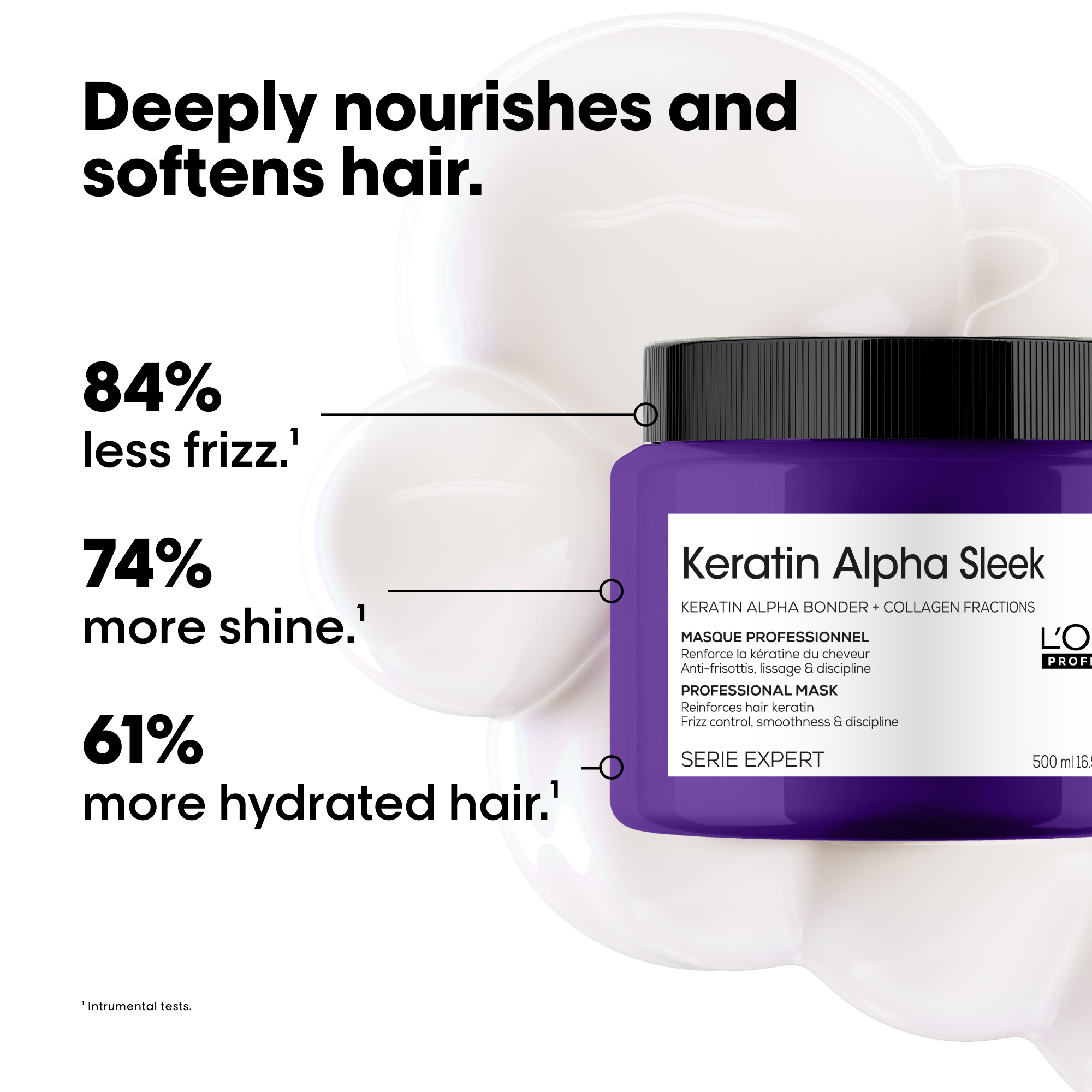 Dit professionele masker verlengt en versterkt de werking van de Keratin Alpha Sleek routine en zorgt voor zichtbaar gladder, zachter en glanzender haar vanaf de eerste toepassing. Het hydrateert intensief, vermindert droogheid en maakt het haar soepel en zijdezacht zonder het te verzwaren.