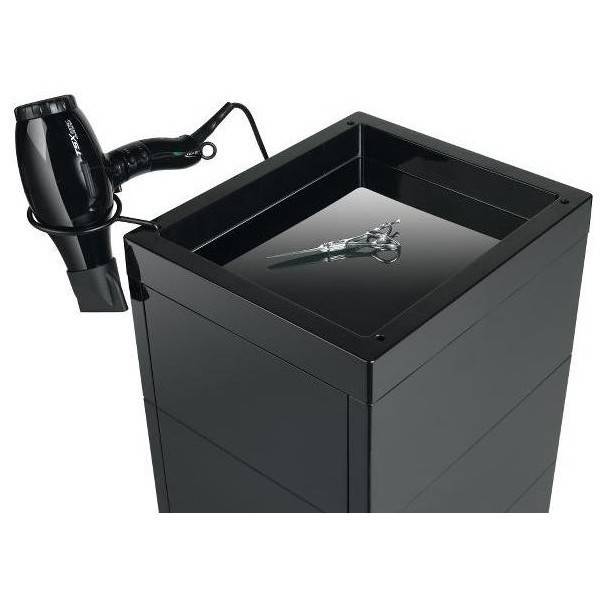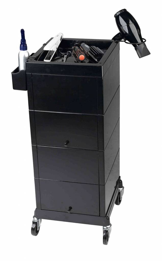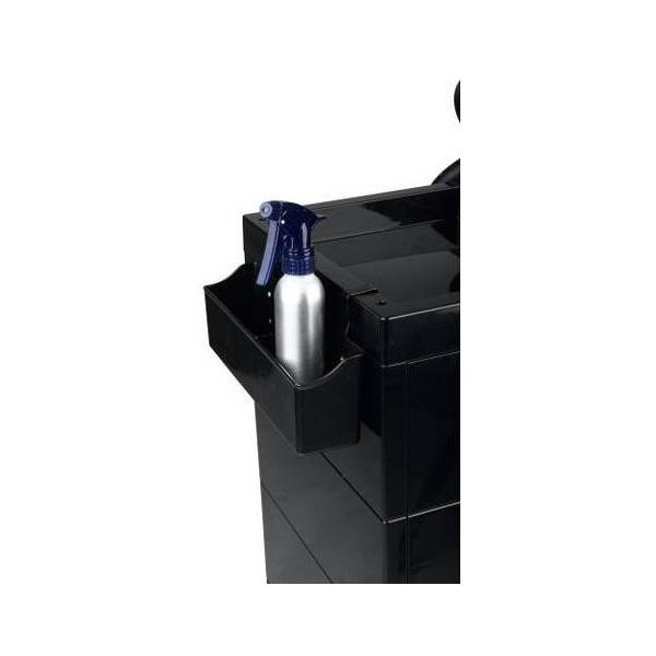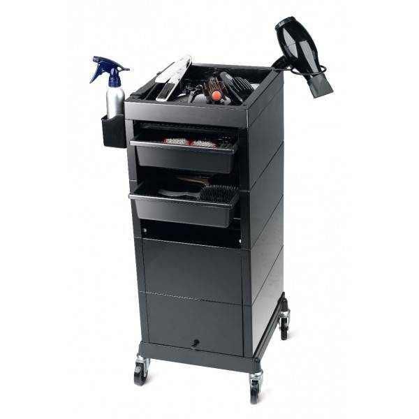 De Werkwagen Sibel Discrete Zwart is een trolley die aan vier zijden gesloten is zodat alles netjes opgeborgen is met twee klapdeurtjes. Zo is alles uit het zicht en houd u uw salon netjes. De werkwagen maakt weinig geluid wanneer u deze verplaatst, door de low noise wielen.