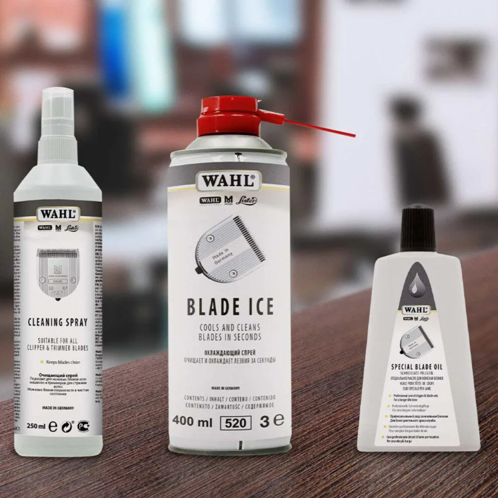 - Wahl Blade Ice (400 ml): 4-in-1 spray voor directe koeling, reiniging, smering en corrosiebescherming.