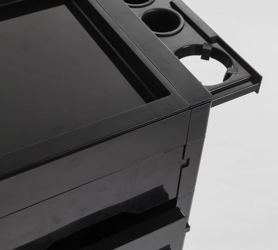 Stijlvolle werkwagen op grote rubberen wielen. Rijd heel soepel en krast niet op zachte vloeren. Kleur zwart met 4 ruime laden. Extra klepjes aan de zijkant voor kleine zaken zoals verfkwasten enz.